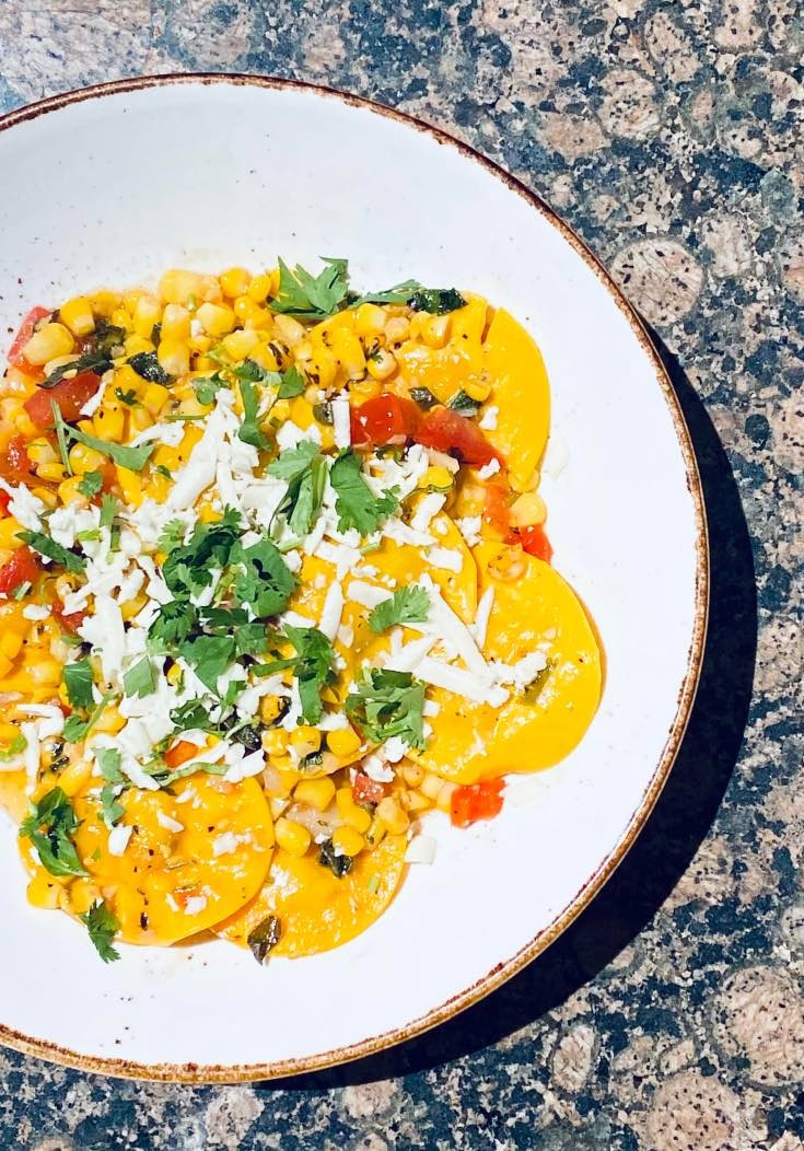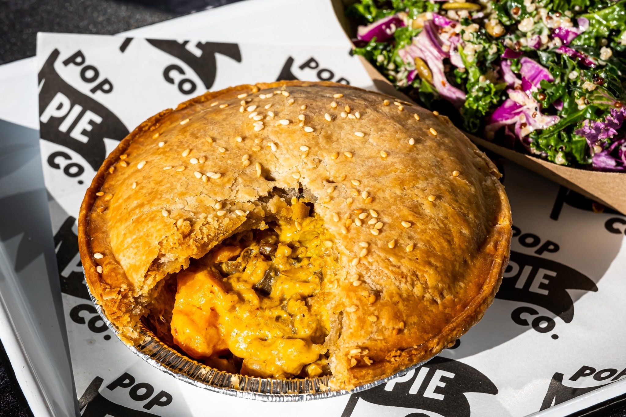 This vibrant and vegan-friendly pie is full of hearty vegetables including roasted cauliflower, sweet potato, mushroom, yellow squash, red onion, and carrots in a rich creamy coconut milk